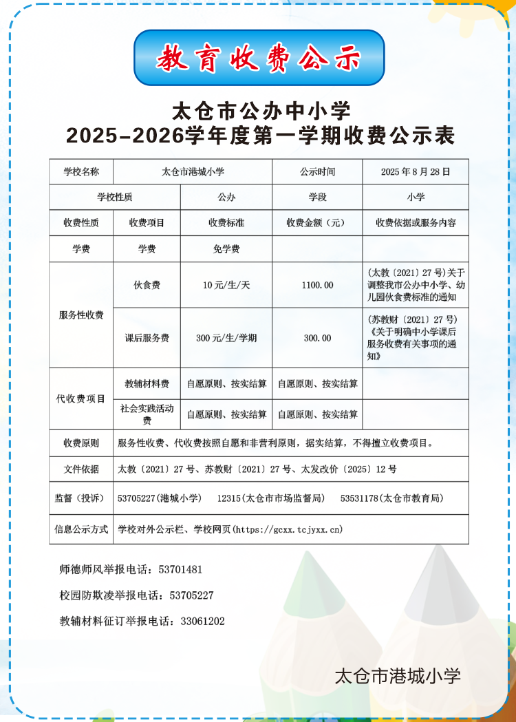 收费公示(太仓市港城小学2025-2026 学年度第一学期)