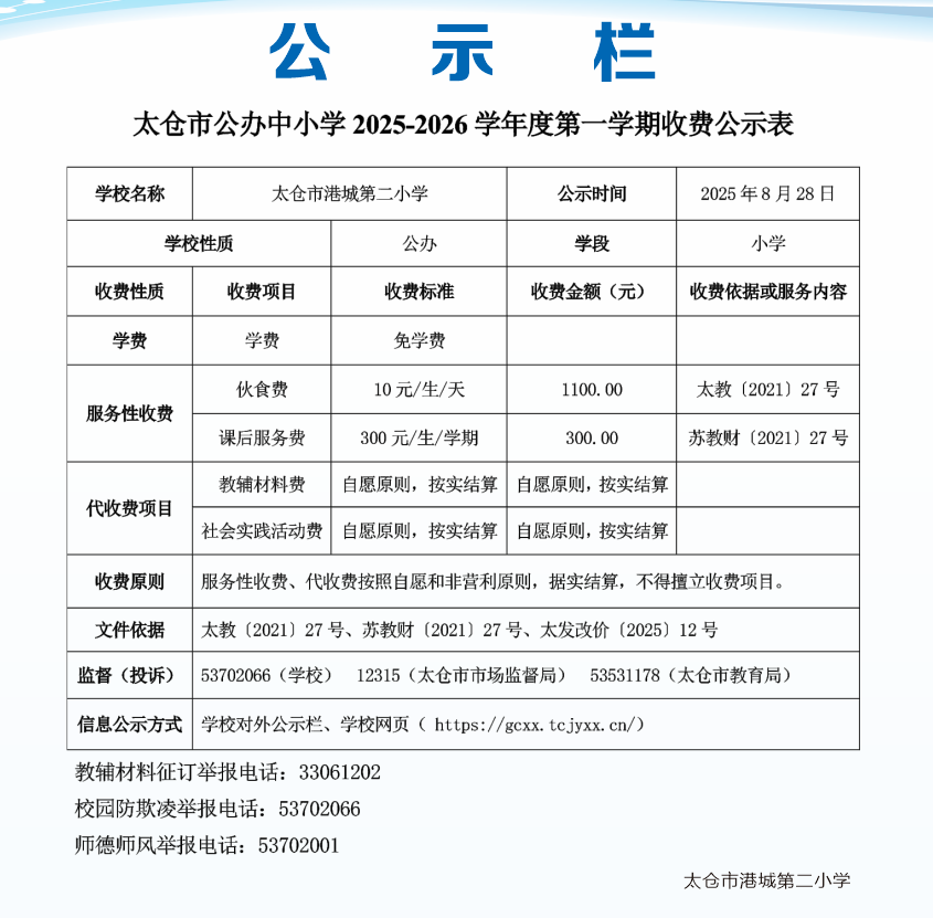 收费公示(太仓市港城第二小学2025-2026 学年度第一学期)